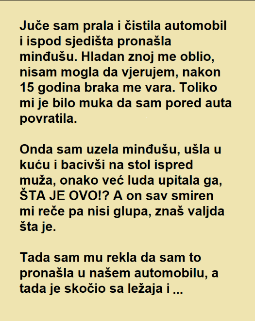 - Naizgled običan čin čišćenja kola pretvorio se u početak unutrašnje oluje. Kada je žena pronašla minđušu koja nije bila njena, srce joj je ubrzalo, a misli su se razletele u pravcu koga se plašila – neverstva. Iako je muž pokušao da objasni kako je automobil pozajmljivao kolegi i da sve deluje kao slučajnost, taj predmet u njenim rukama postao je simbol sumnje koju više nije mogla ignorisati. U jednom trenutku, poverenje izgrađeno godinama počelo je da se ljulja.