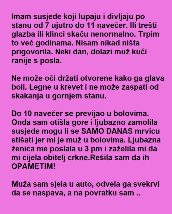 Na brzinu je spustila ruku, uzela muža i otišla kod svekrve, rekavši sebi: “Neću se više zamarati. Neću to više trpeti.” Bilo je vreme za promene. Nije se trudila da previše analizira šta će se desiti, samo je želela da se opusti i oslobodi tog tereta. Susedi će i dalje biti bučni, ali ona više neće biti ta koja će trpeti. Niko nije imao pravo da oduzme njen mir.