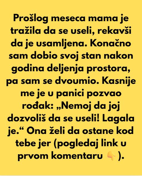 • Odlučio sam da odložim odluku, da malo razmislim. Međutim, u tom trenutku me pozvao rođak, glasom prepunim panike: “Nemoj da joj dozvoliš da se useli!” Bio sam zatečen. “Lagala je!” – dodao je. Osećao sam se kao da mi je neko srušio svet pred nogama. Šta to znači? Rođak mi je objasnio nešto što mi nikada nije palo na pamet: mama je zapravo želela da se preseli kod mene, ali iz sasvim drugih razloga. Nije bila usamljena, već je u pitanju bila navika. Navika da ima nekoga ko se brine za nju. Navika da je neko uvek tu, da je usmeri i pomogne. Nije to bilo iz ljubavi ili stvarne potrebe za društvom, već iz komfora koji je stvorila kroz godine.