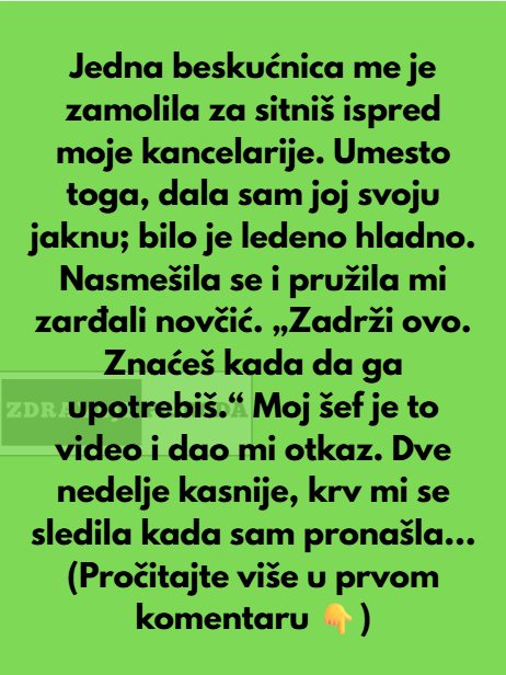 Dani su prolazili, a ja sam nastavila sa svojim obavezama, potpuno zaboravljajući na tu ženu i njen trenutni pogled. Međutim, nekoliko dana kasnije, moj šef me pozvao u svoj ured. Bio je ozbiljan, gotovo zabrinut, i odmah sam znala da nešto nije u redu. “Znam šta si uradila,” rekao je hladno, bez objašnjenja. Srce mi je stalo. Iako nije rekao ništa konkretno, znao je. Znao je da sam pomogla toj ženi, i to je bio razlog da mi uruči otkaz.