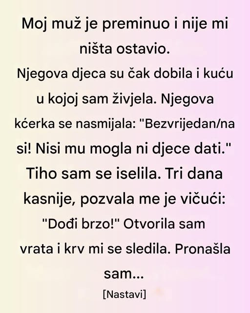 Ali, kada je advokat otvorio oporuku, otkrila sam da je sve što je ostavio bilo prazno — osim jedne stvari. U oporuci je bilo napisano: „Za moju voljenu ženu, samo jedna stvar. Trebalo bi da je pronađeš.“